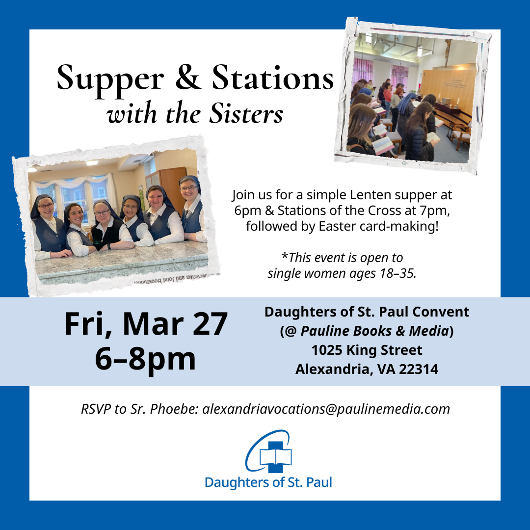 Holy Week Vocational Discernment Retreat (Boston, MA) Experience the life, mission, and spirituality of the Daughters of St. Paul at this Come and See Discernment Retreat during the Sacred Triduum! April 1-6, 2026 Boston, Massachusetts For single Catholic women ages 18-30 Retreat includes: Triduum Liturgies, community prayer, Eucharistic Adoration, conferences by the Sisters, experiences of the…