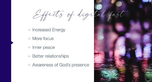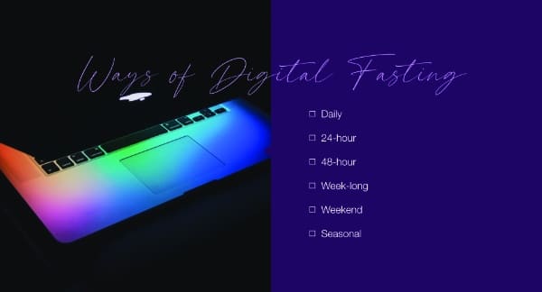 - Do a complete digital fast by turning off your phone and digital devices and store them away for a 24-hour period. Evaluate how many times you had the urge to turn on your phone or iPad during that time. What did you do instead?